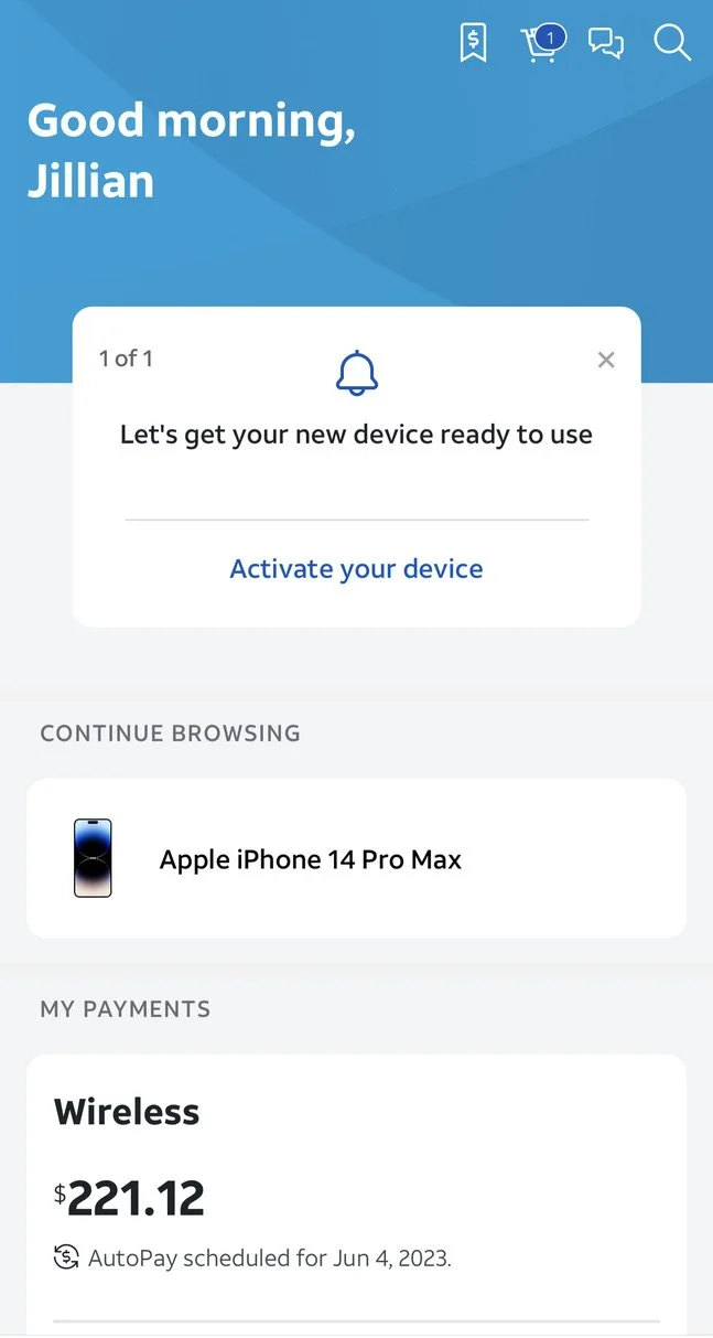 myAT&T app Welcome Center cards